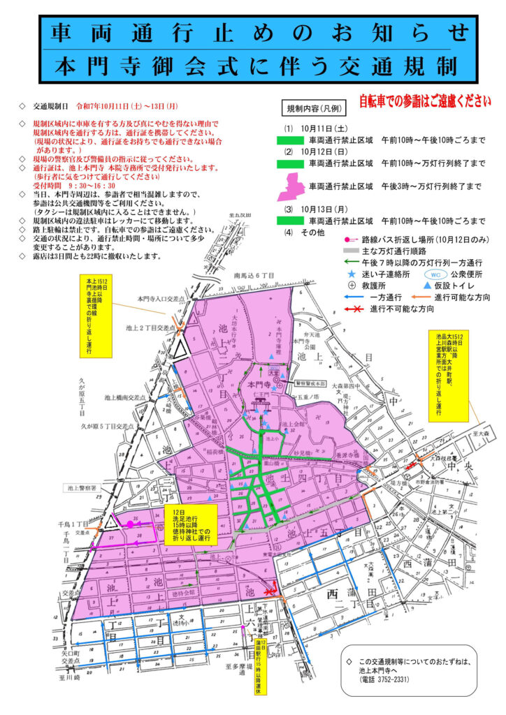 2025年は11日(土)〜13日(月・祝)と週末にかかり、特に混雑が見込まれるため万灯練供養の見物、池上本門寺への参拝は徒歩がおすすめです。交通規制エリア内には駐輪場はありませんのでご注意下さい。