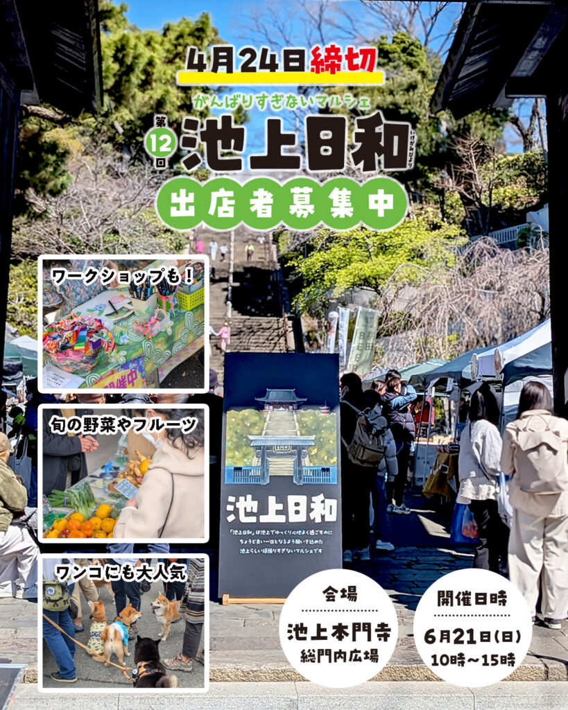 | 応募条件 | 1)出店内容を主な生業とされている方。 2)同様のイベントへの出店経験がある方。 3)食品調理販売をされる場合は、営業許可証を取得されている方。 4)申込時に提示する出展要項等をよくお読み頂いた上で、池上日和の趣旨・運営に賛同いただける方。 5)反社会勢力に関わりがないこと。 6)宗教、政治活動を目的としないこと。 7)法令、公序良俗に違反しないこと。 8)その他、詳細は申込フォームでご確認いただけます。 |