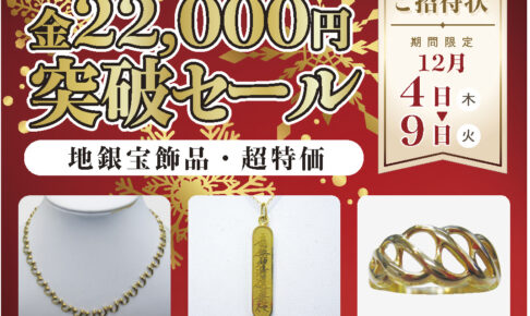 2025年12月4日(木)〜9日(火)の期間限定! 池上本門寺通り商店会「ジュエル服部」にて、「 金22,000円突破セール」 が開催されます♪ 地金装飾品が超特価で大放出! この機会に、年末年始を華やかなジュエリーで迎…